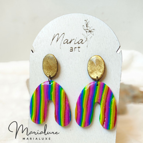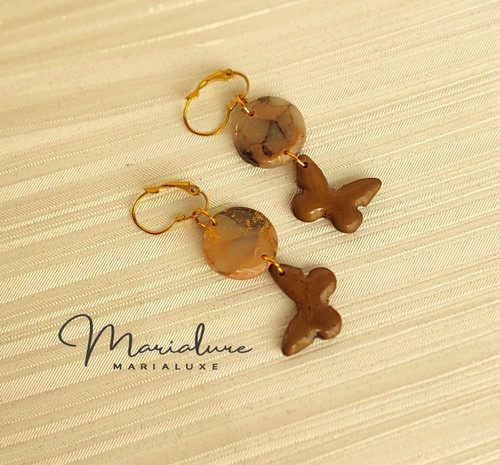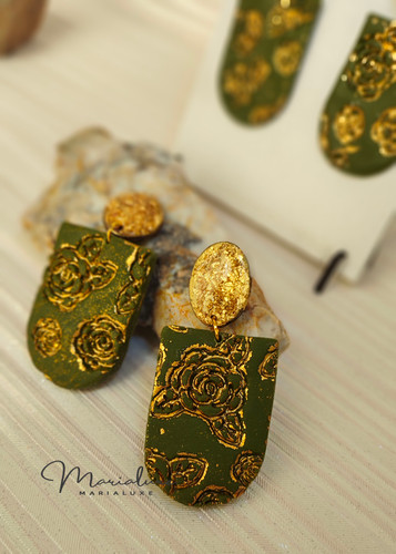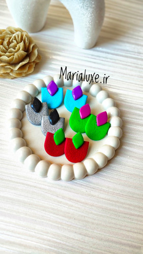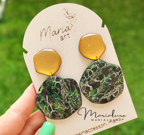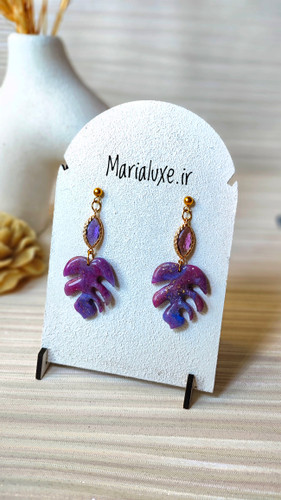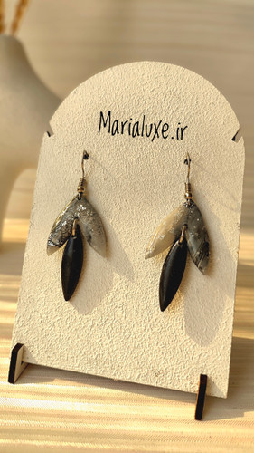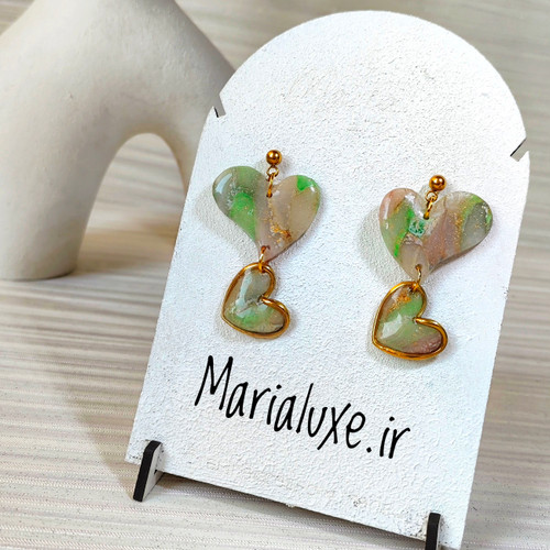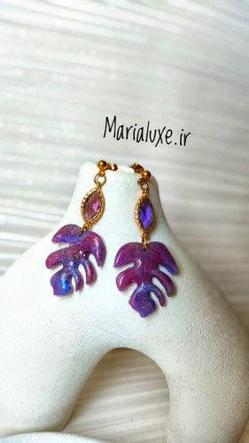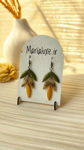گوشواره پلیمری طرح برگ با سنگ طلایی | دستساز، سبک و ضد حساسیت