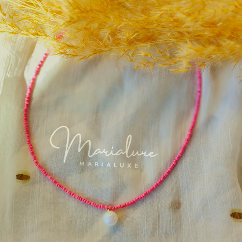 گردنبند مینیمال منجوق و مروارید دفرمه با آویز صدف طبیعی