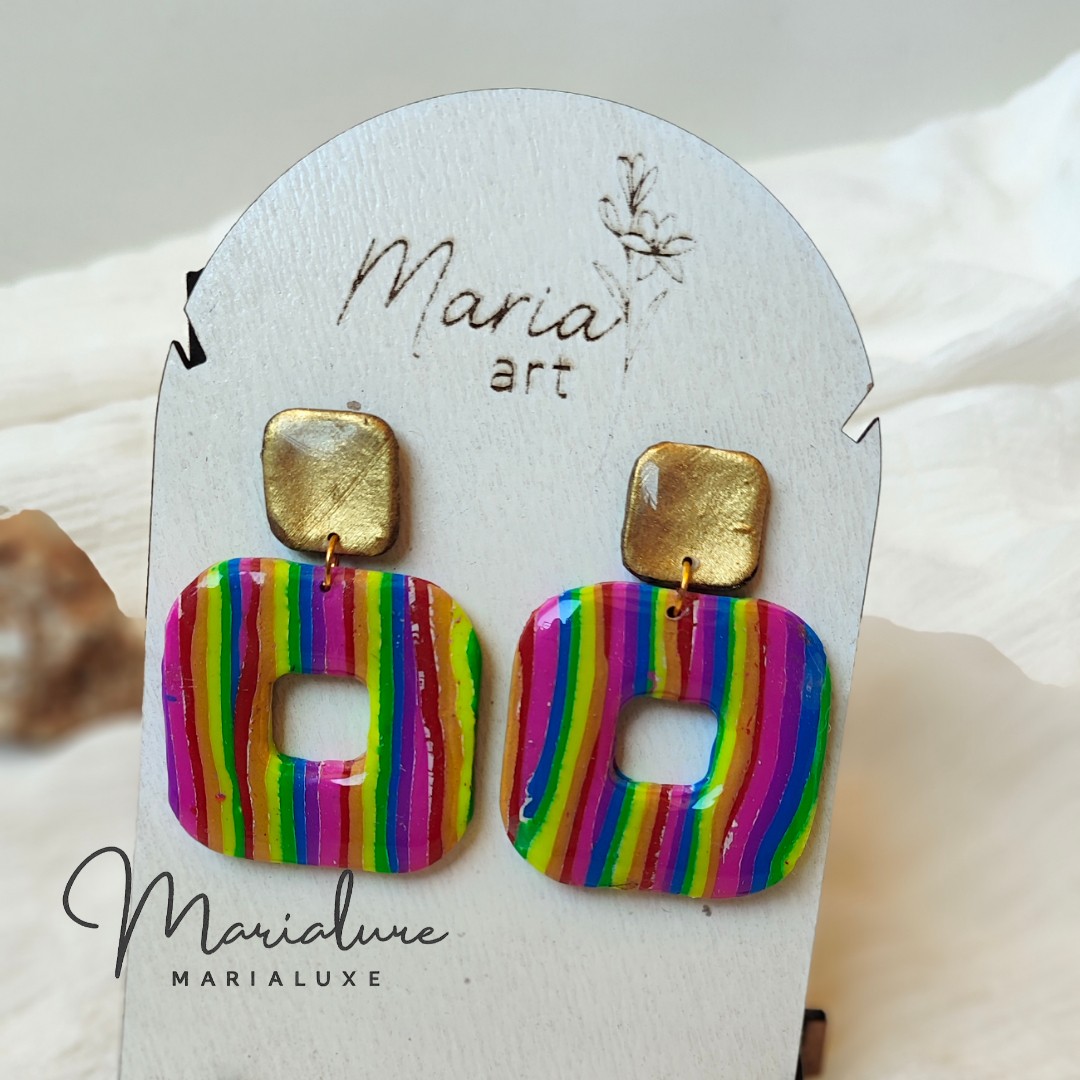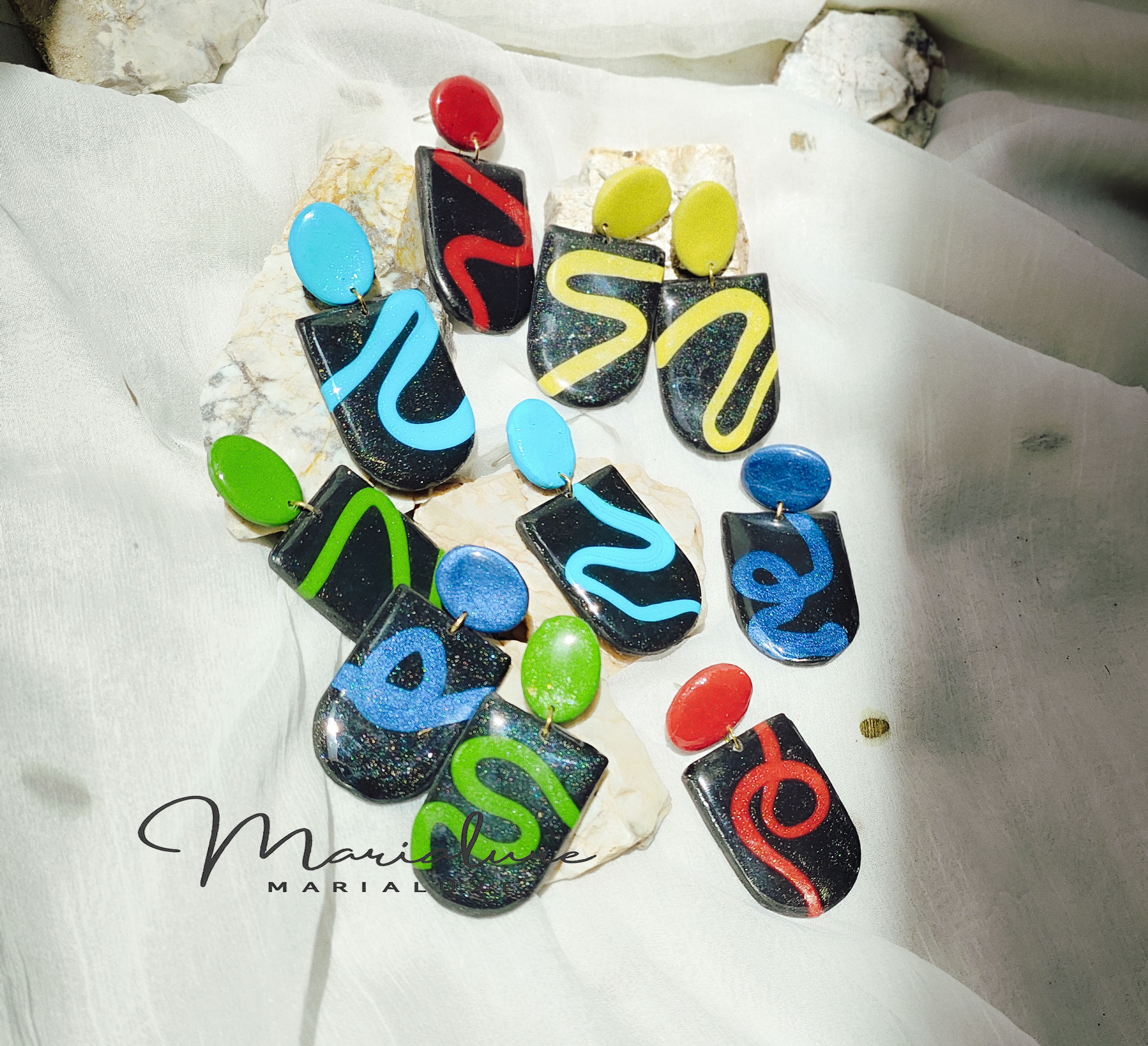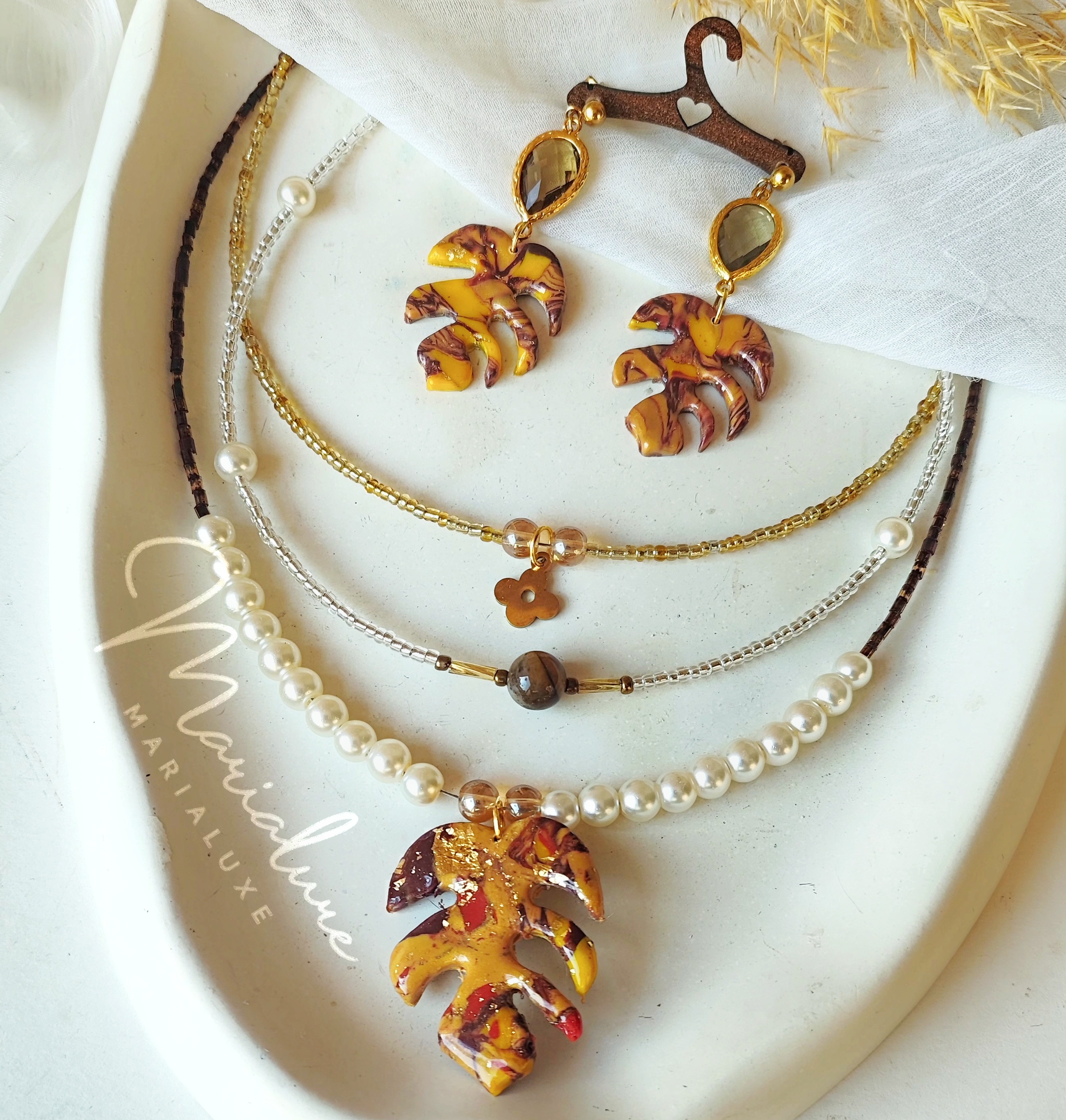 گوشواره پلیمری طرح برگ با سنگ طلایی | دستساز، سبک و ضد حساسیت